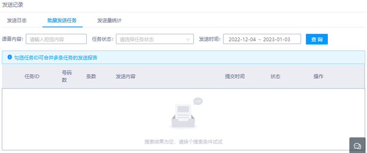 右側[批量發送]中,可通過同樣篩選進行批量任務記錄查詢;