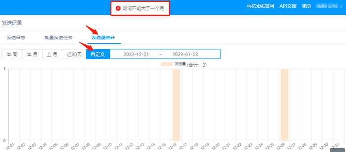 路徑[控制臺>驗證碼通知短信>發送記錄],右側[發送量統計],可查看范圍性發送量柱狀圖;