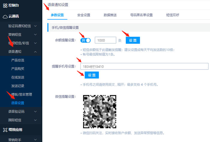路徑[控制臺(tái)>語(yǔ)音通知短信>語(yǔ)音設(shè)置],右側(cè)[參數(shù)設(shè)置]下為對(duì)應(yīng)功能配置,不做調(diào)整將不做提醒,注冊(cè)賬號(hào)后請(qǐng)及時(shí)關(guān)注。